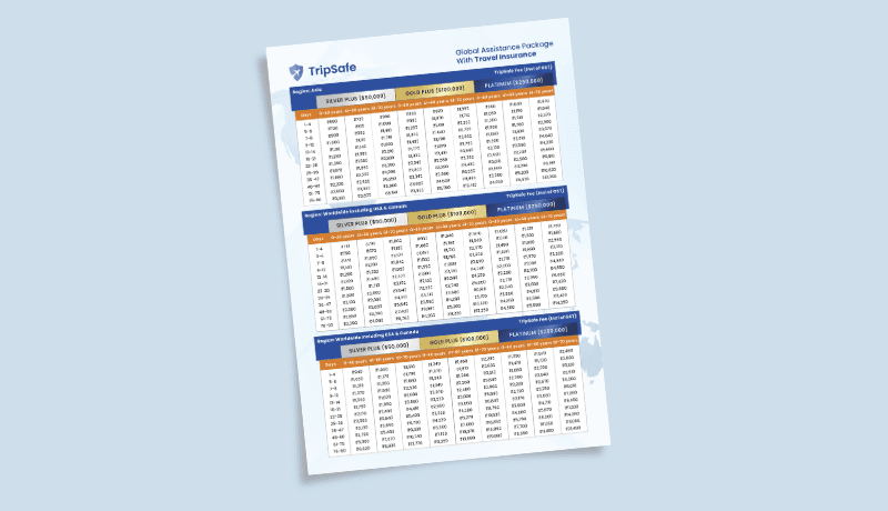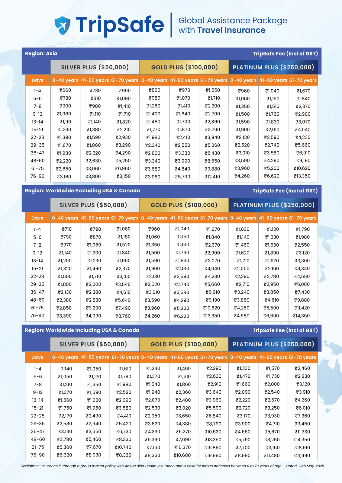 Pricing for TripSafe Classic Silver, TripSafe Classic Gold, TripSafe Silver Plus, TripSafe Gold Plus & TripSafe Platinum varies with the age of the traveller, and covers travellers between 0 and 70 years of age.