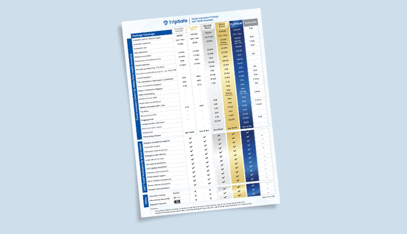 TripSafe is a comprehensive travel assistance package that covers a wide range of potential problems you might face during a trip. It includes assistance services like emergency cash, travel alerts, passport and luggage lost assistance and a 24/7 hotline for any travel emergency. It also includes covers like trip cancellations, medical emergencies, lost luggage, travel delays, and more. It’s designed to give you peace of mind by protecting you against various unexpected events that could disrupt your travel plans.