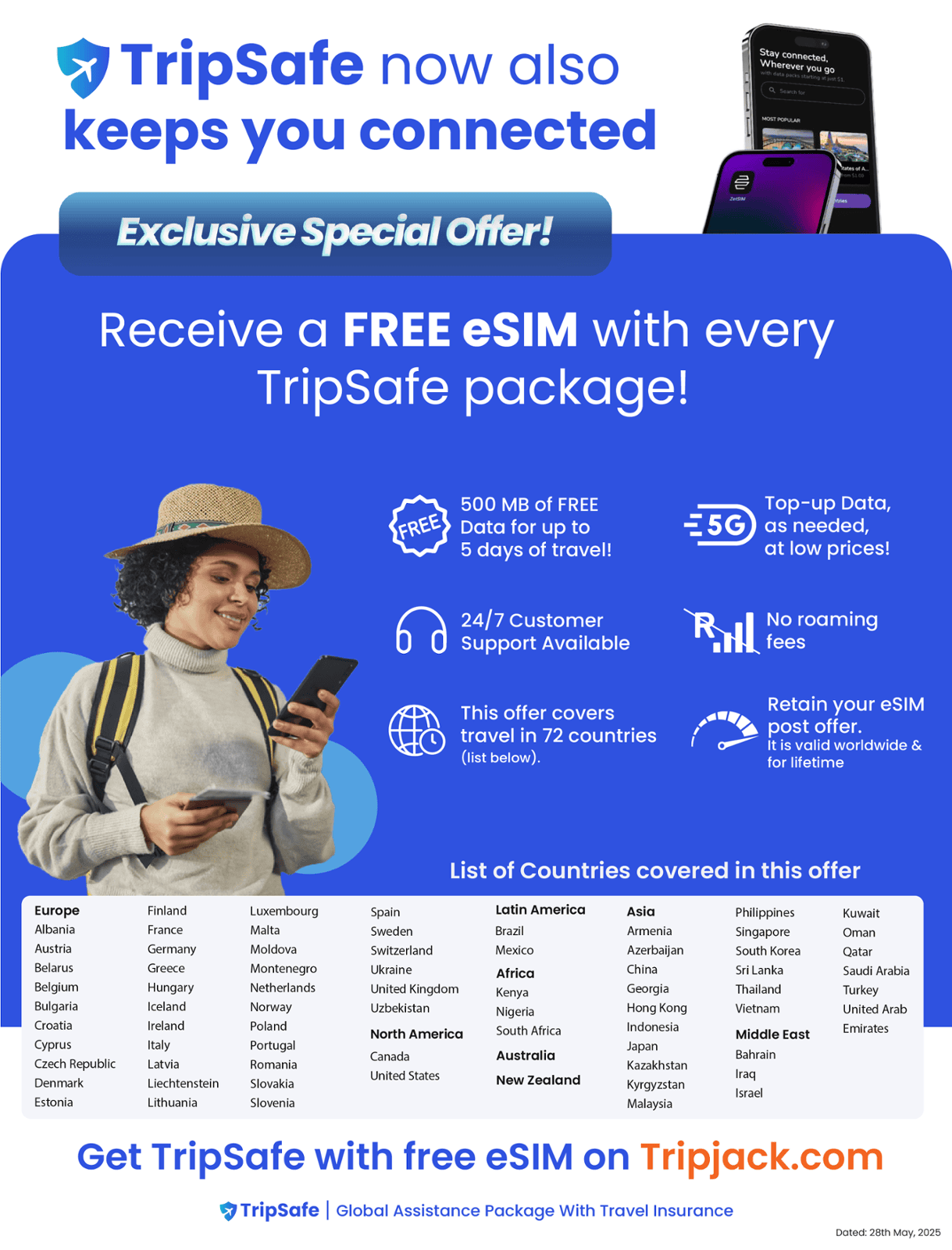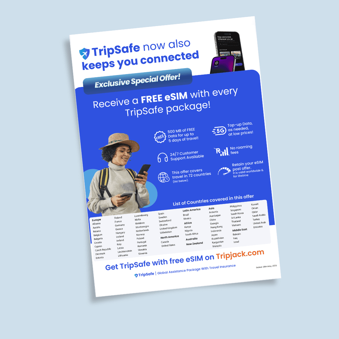 Designed specifically for international travellers, this comprehensive travel assistance package ensures that you're safeguarded against unexpected events, allowing you to focus on enjoying your journey with peace of mind. Whether you're traveling for business or leisure, it provides financial security during unforeseen disruptions. TripSafe offers extensive coverage for your overseas trips, protecting you from key risks such as trip cancellations, medical emergencies, lost or damaged baggage, flight delays, and a lot more.