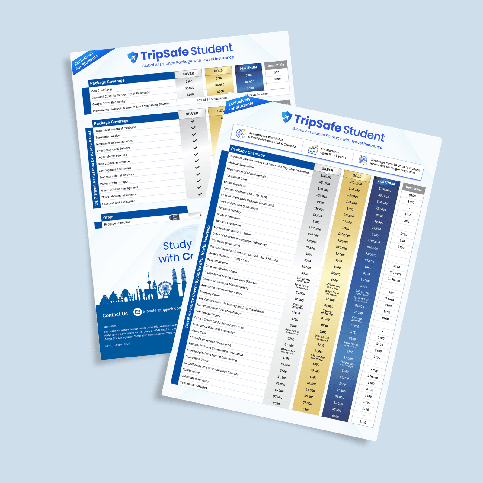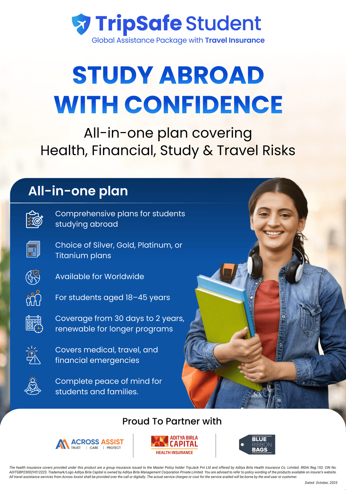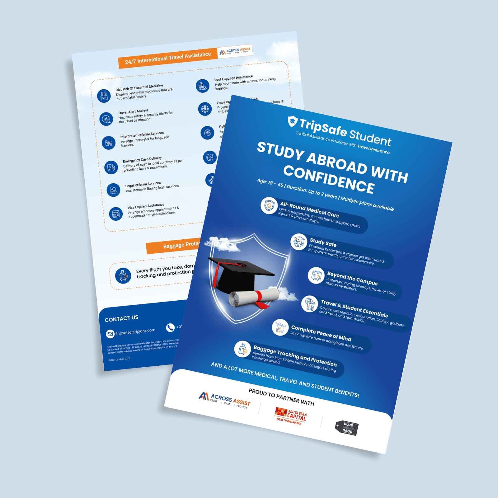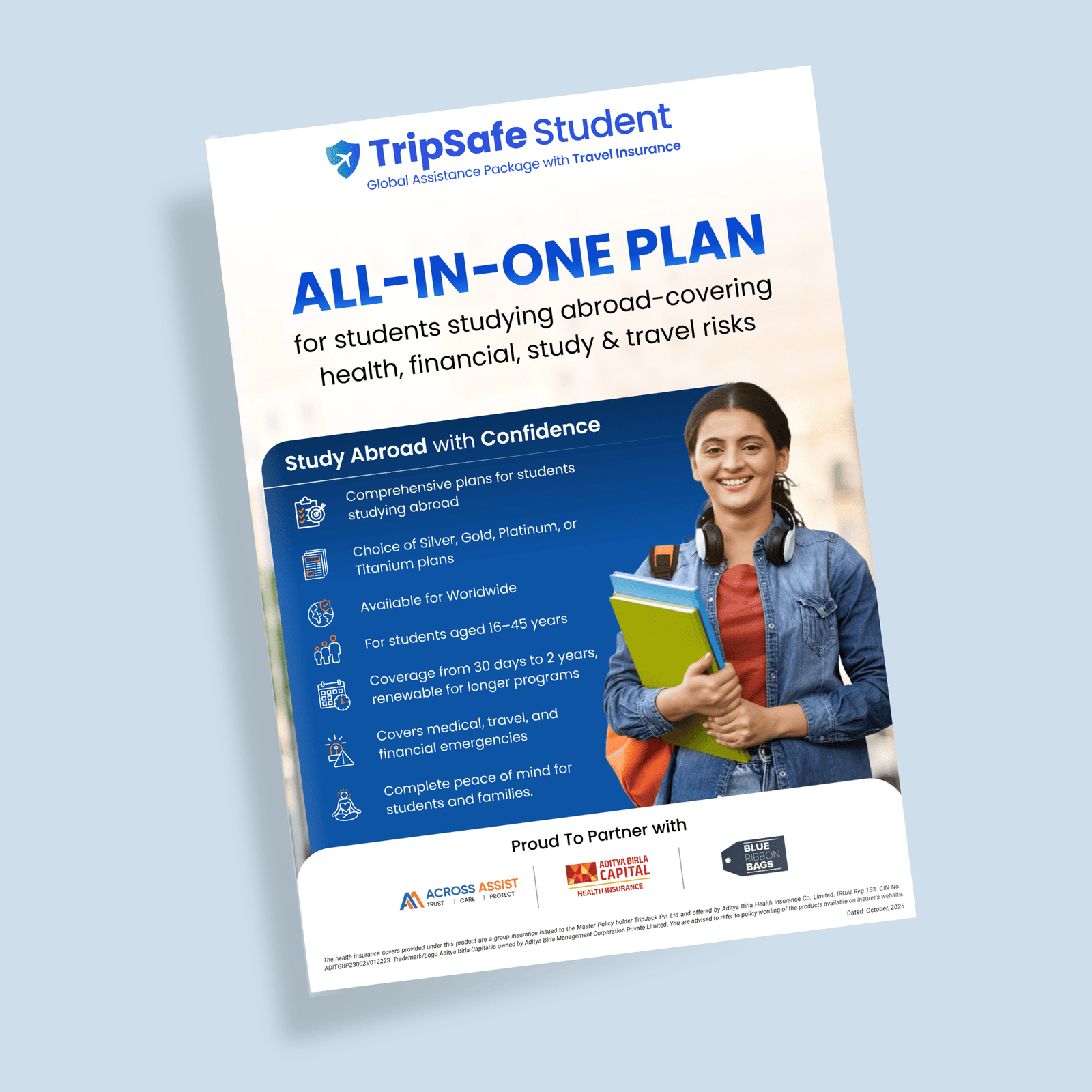 TripSafe Student is a smart, all-in-one travel insurance plan created exclusively for students studying abroad. It goes beyond basic medical cover — protecting your health, studies, and peace of mind wherever you go.